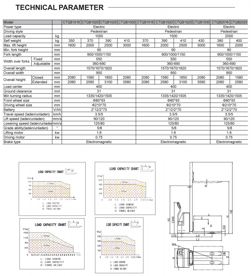 - Capacity from 1.0t-2.0t, lift height(1t-1.5t) 1.6m-5.0m, 2ton from 1.6m-3.0m